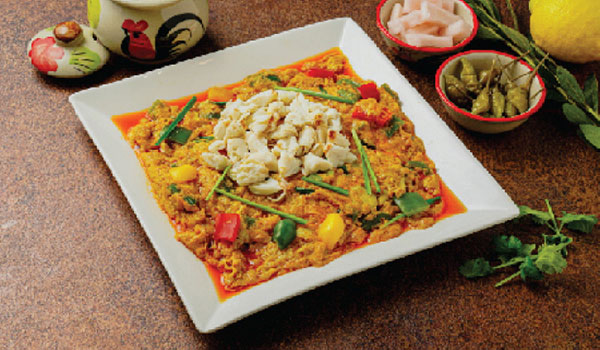 바삭하게 튀긴 소프트쉘 크랩과 각종 채소를 넣은 옐로우 커리